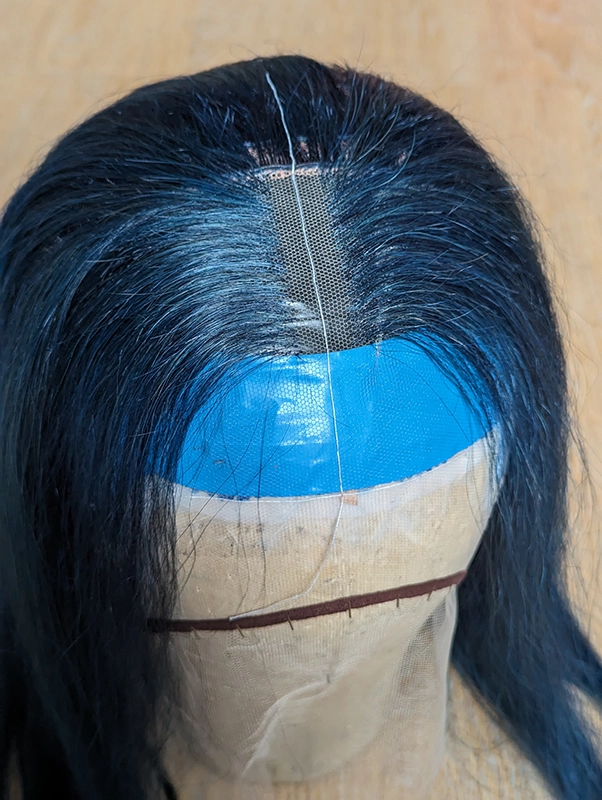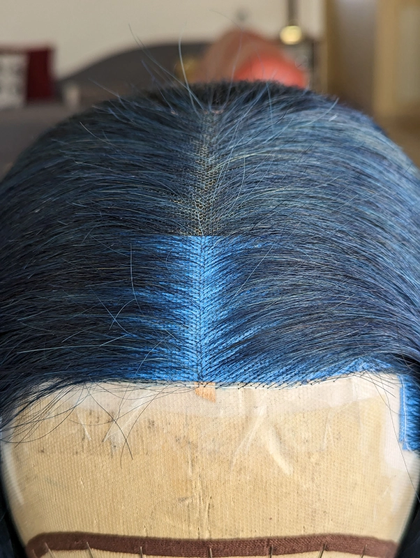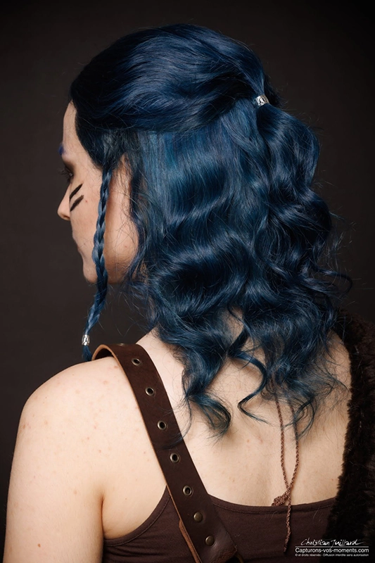 Pour ce projet, j’ai imaginé un cas réel de spectacle où l’actrice doit incarner une guerrière aux cheveux bleus. Pour ne pas avoir à teindre les vrais cheveux de l’actrice, la compagnie a fait le choix de faire réaliser une perruque réaliste sur mesure.
