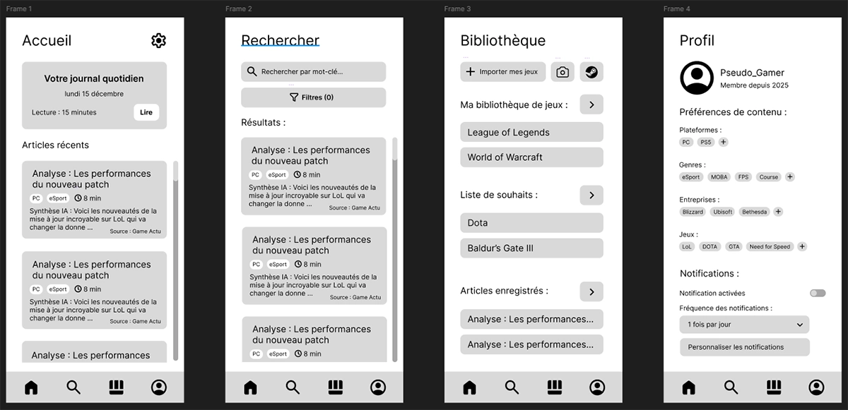 Avec mon groupe, nous avons décidé d’imaginer la création d’une application de veille dans le domaine du jeu vidéo, pour avoir toutes les actualités et se tenir au courant.